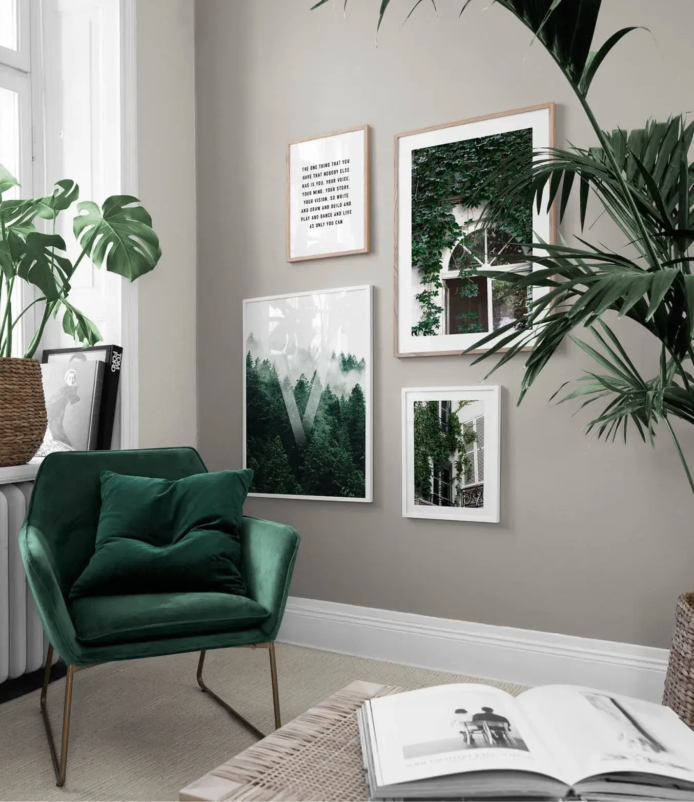 Зелёный цвет напрямую ассоциируется с ландшафтом и природной средой. Чтобы усилить это ощущение, в интерьер стоит интегрировать живые растения — как крупные в напольных кашпо, так и более компактные композиции на столах и подоконниках. Дополнительный визуальный эффект создают декоративные решения: обои с ботаническим мотивом, постеры с изображениями листьев, подушки в оттенках мха, шалфея, эвкалипта. Такой фон создаёт успокаивающее впечатление, напоминающее прогулку по саду или лесу.