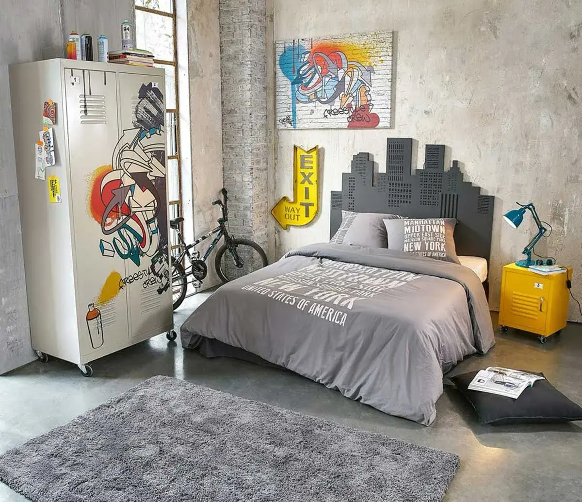 Если подросток увлекается искусством, можно предложить оформить одну из стен самостоятельно. Стрит-арт как стиль позволяет объединить креатив и индивидуальность. На стенах могут появиться принты, граффити, элементы уличной среды. Дополнить образ помогут декоративные объекты в стиле урбанизма — таблички, сетки, конструкции, напоминающие городское пространство.