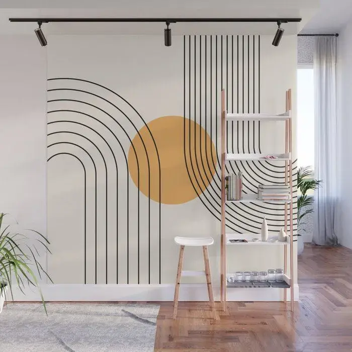 Графика в интерьере может быть архитектурной. Крупные геометрические фигуры на стене — способ ввести ритм и подчеркнуть зонирование. Цвет подбирается в зависимости от основной палитры: это может быть контрастный оттенок или углублённый тон из существующей гаммы. Графику частично можно перекрыть мебелью — это добавит живости и избавит от излишней симметрии.