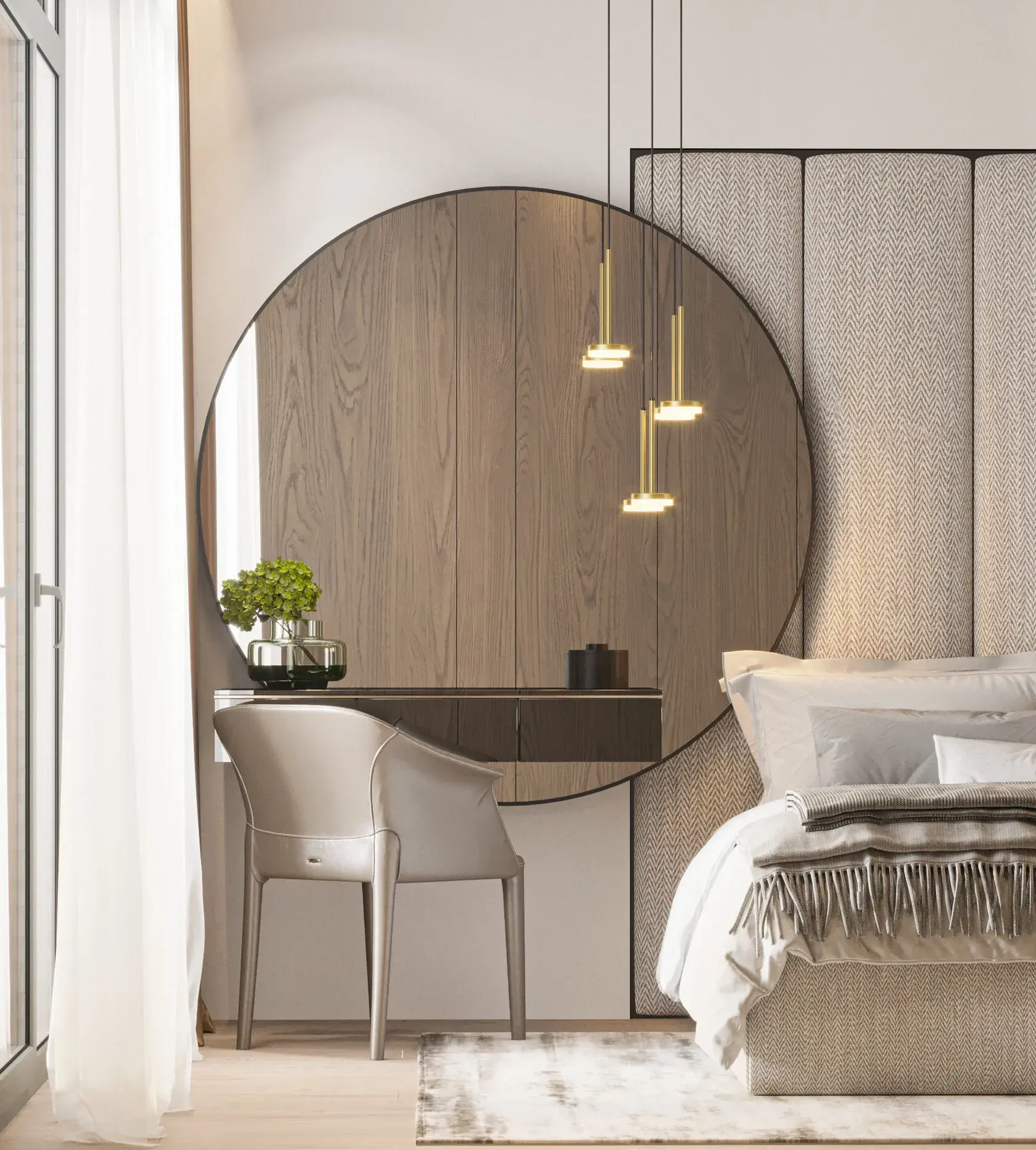 Эффектный способ оформления стены в спальне — использование объёмной панели из ткани. Такая конструкция особенно уместна за изголовьем кровати. Светлая гамма и глубокая фактура создают ощущение уюта, а точечное освещение по краям усиливает атмосферу. Панель может быть выполнена из велюра, льна, рогожки или искусственной замши — выбор зависит от общего стилевого направления.