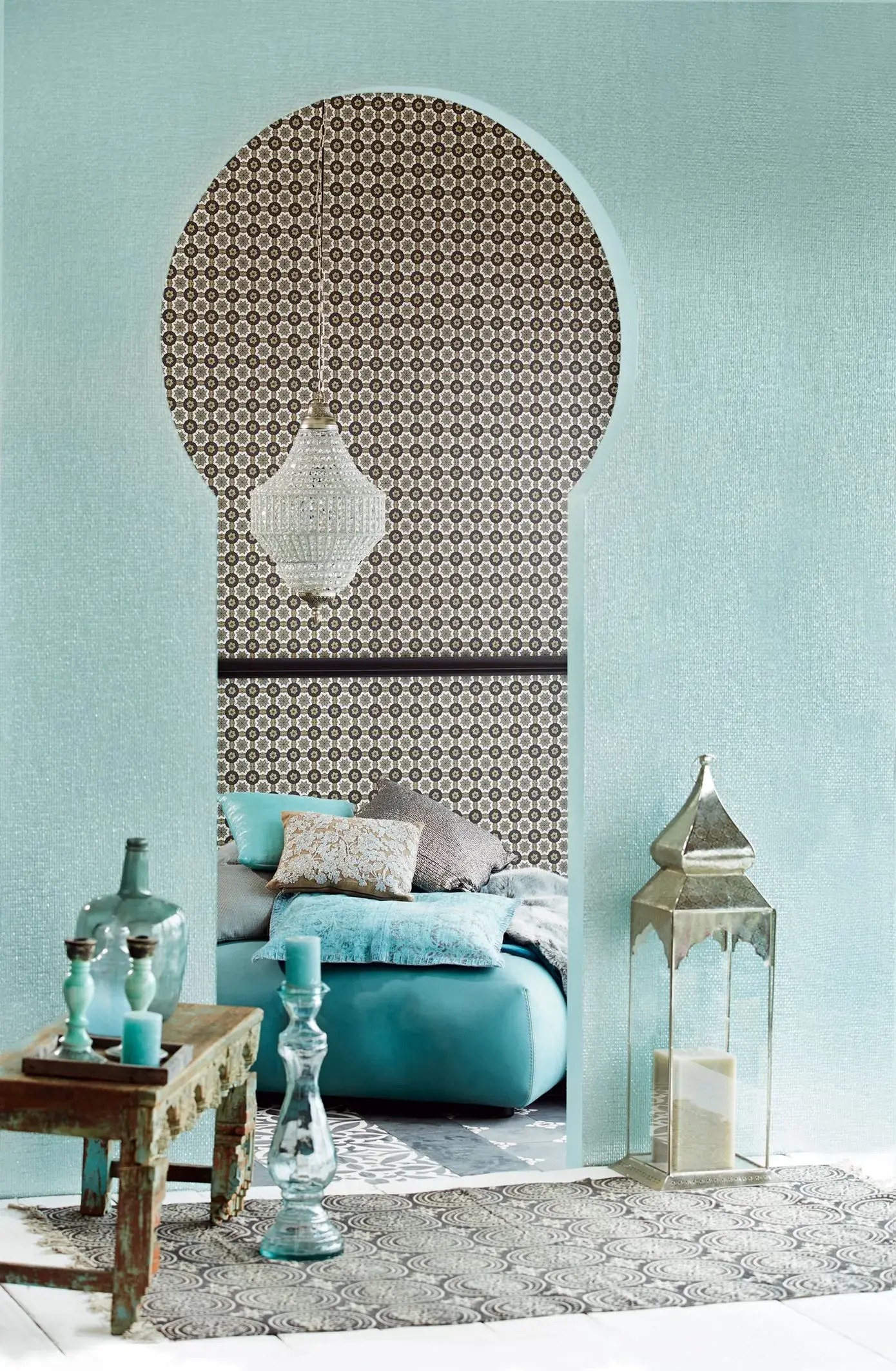 Палитра марокканского стиля яркая, но сбалансированная. Центральное место занимает синий цвет — от небесно-голубого до глубокого индиго. Именно в такие оттенки традиционно окрашивают потолок. На стенах чаще всего используются светлые тона, которые дополняются насыщенными деталями: фиолетовыми, бирюзовыми, розовыми. Этот приём позволяет сохранить лёгкость и добавить ритм.