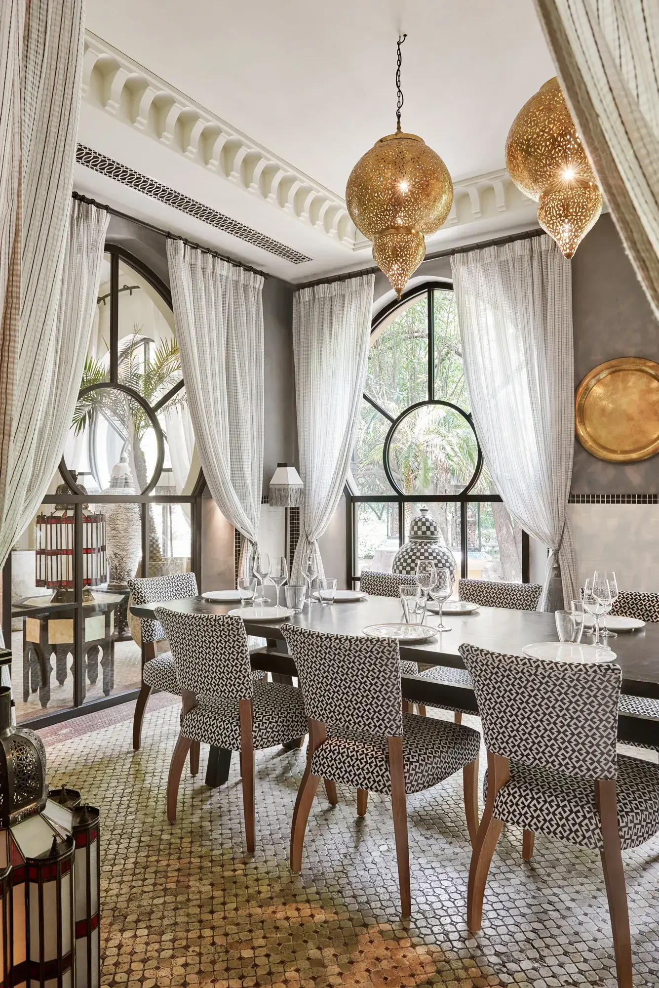 Невозможно представить марокканский интерьер без множества подушек, ковров и пуфов. Мягкие сиденья, низкие столики и кушетки создают комфортную, почти расслабляющую обстановку. В качестве материалов преобладают бархат, шёлк и другие натуральные ткани. Центральное место в гостиной занимает массивный мягкий диван, дополненный табуретами и миниатюрной мебелью.