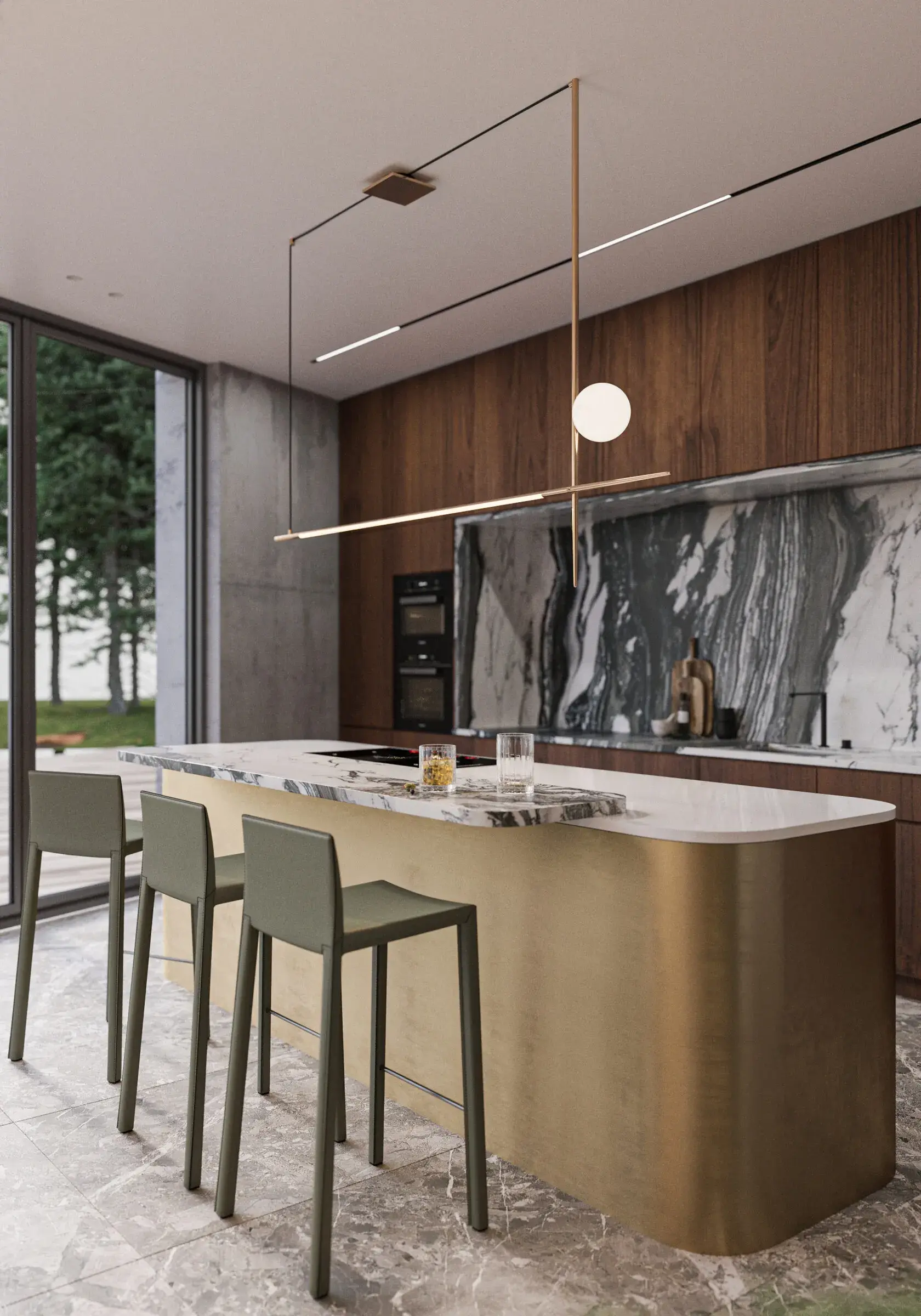 Также цвет фартука можно увязать с другими акцентами: стульями, фасадами острова, абажурами, предметами текстиля. Особенно важно это в кухнях, объединённых с гостиной. В таком случае фартук может поддержать гамму дивана, штор или ковра. Всё это помогает создать согласованный дизайн интерьера, в котором нет случайных элементов.