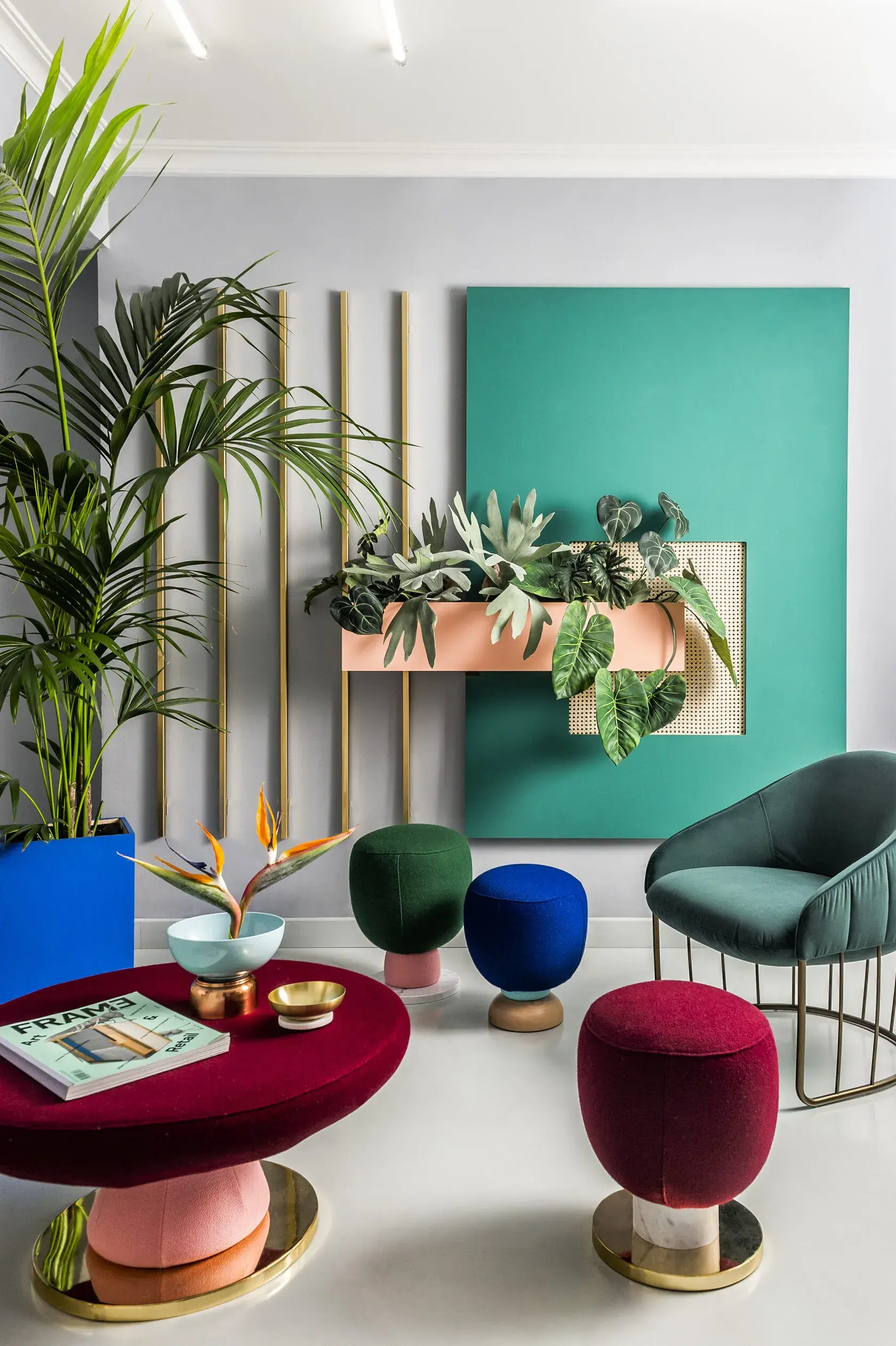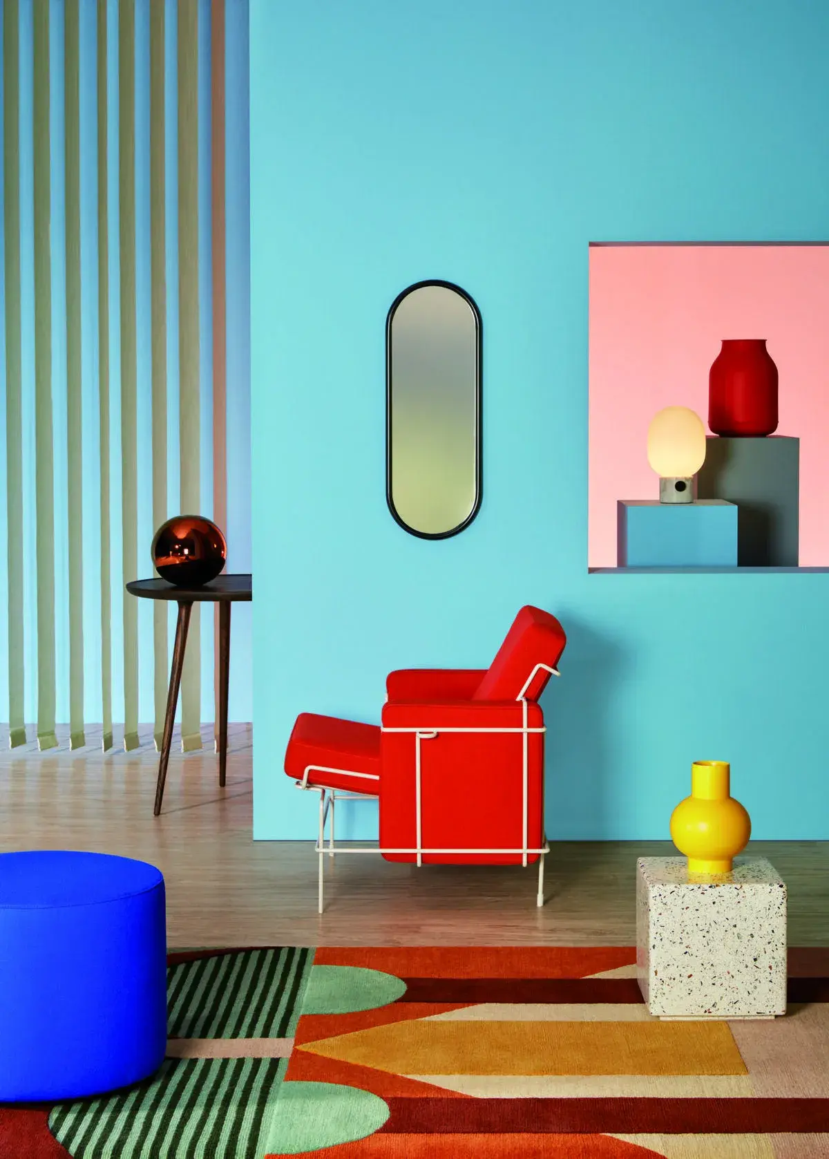 В этом стиле предметы интерьера воспринимаются как арт-объекты. При этом они сохраняют удобство и функциональность. Мебель часто контрастна по форме и материалам: стеклянный столик сочетается с кожаным диваном, а рядом может стоять пластиковая тумба. Эксперименты уместны — стиль мемфис не терпит шаблонов. Когда-то ему даже была посвящена коллекция мебели A tribute to Memphis, в которую вошли смелые диваны, кресла и элементы в броской палитре.