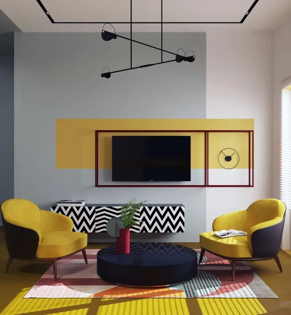 Цветовая палитра стиля яркая, сочная и контрастная. Здесь оттенки не выступают в роли деталей, а формируют общее восприятие пространства. Например, стены могут быть насыщенно-синими или зелёными, на их фоне появляются предметы мебели в красном, жёлтом или лиловом цвете. Цвет не поддерживает, а спорит, создавая визуальный ритм.