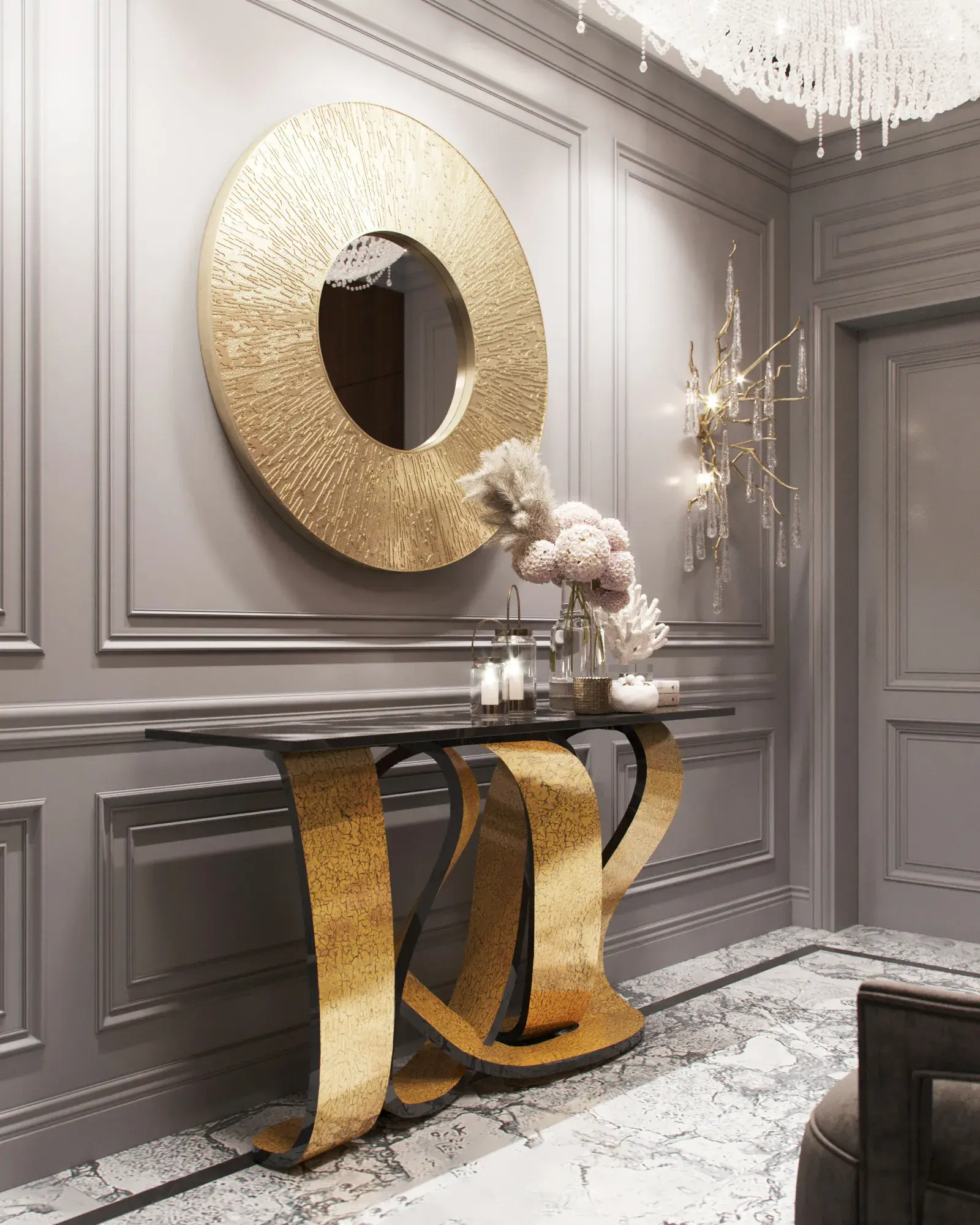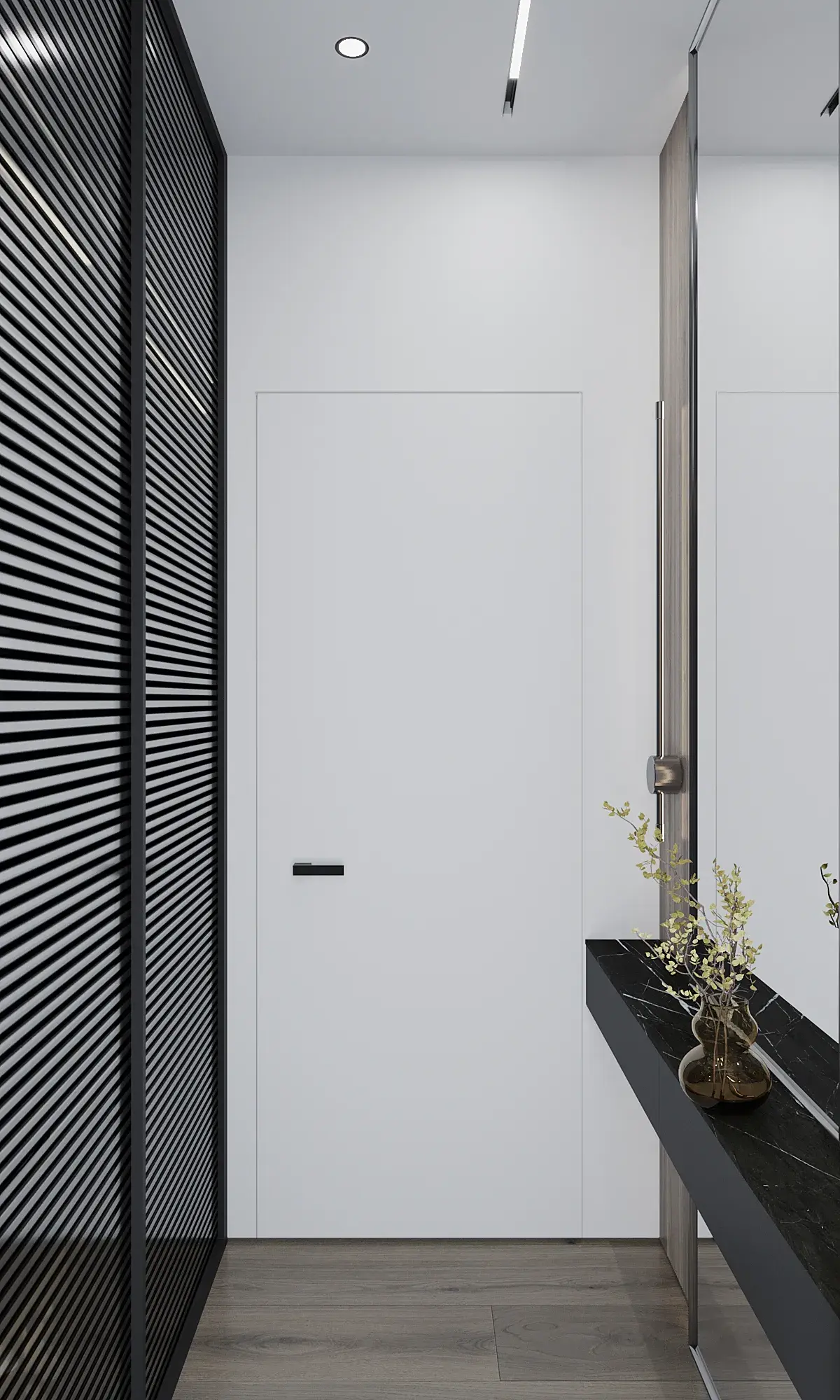 Компактная консоль поможет упорядочить мелочи и сделает зону у входа более удобной. На её поверхности можно разместить ключи, мелкие аксессуары или декор: например, поставить вазу с цветами или ароматическую свечу. При правильном подборе такая деталь придаёт интерьеру завершённость.