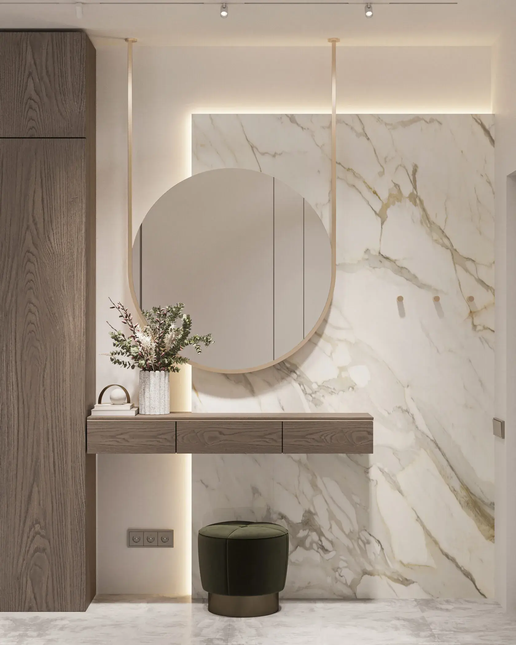 Чтобы сохранить ощущение простора, стоит выбирать изящные осветительные приборы. Подвесы на тонких шнурах или аккуратные настенные бра не перегружают композицию и визуально вытягивают пространство, делая его более элегантным.