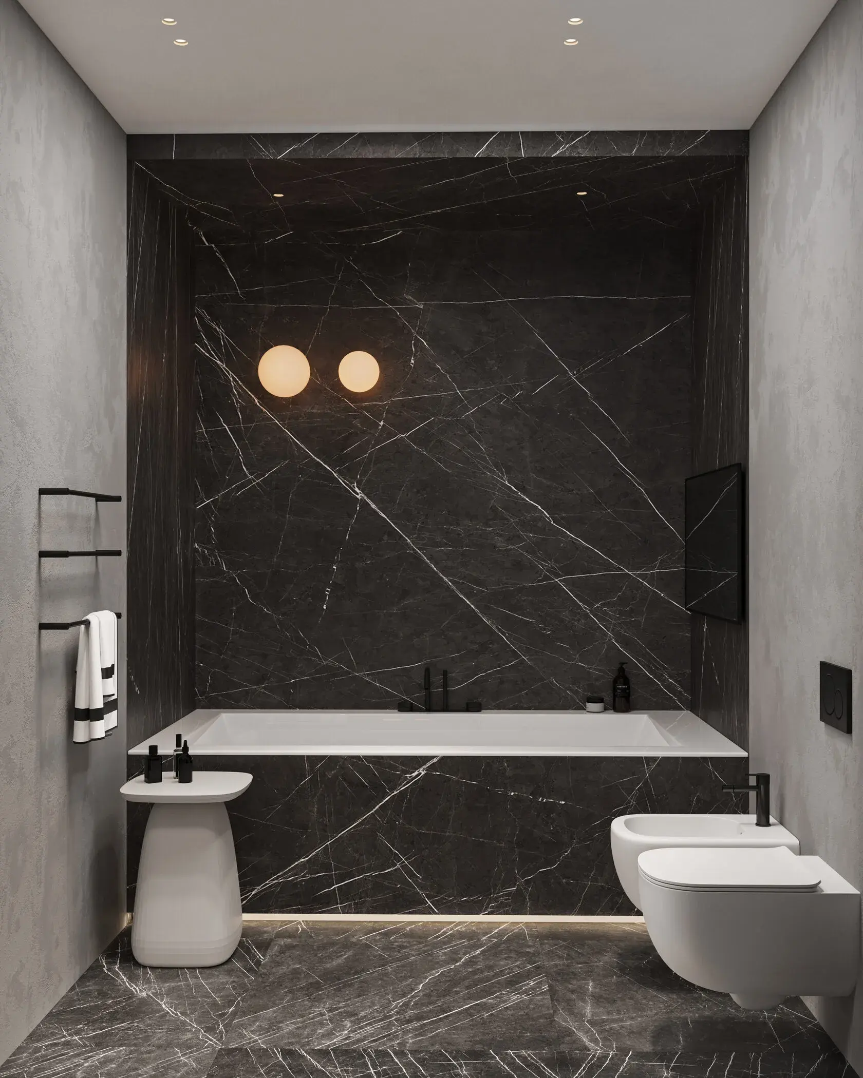 Кафель с изображениями морских обитателей, античных ваз и пальм устарел. Если хочется выразительности, лучше поиграть на контрастах цветов и фактур. Хорошо работает сочетание краски, декоративной штукатурки и акцентной плитки на одной из стен.